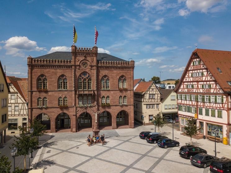 Das Rathaus ist der Blickfang des Marktplatzes. Der neugotische Stil des Gebäudes ist selten in Süddeutschland. Die einzige, allerdings „große“ Schwester, steht als Münchner Neues Rathaus am dortigen Marienplatz. Die Pläne entwarf der badische Baudirektor Theodor Fischer.